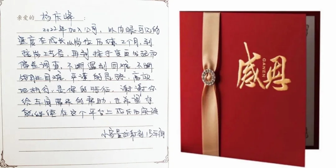 感謝卡:2022年加入公司,以肉眼可見的速度在成長,從崗位歷練2個月,到接崗工藝員,再到接手變更發(fā)起和偏差調(diào)查,不斷遇到困難,不斷戰(zhàn)勝困難。嚴(yán)謹(jǐn)?shù)乃悸罚咝У貓?zhí)行,是你的特征,謝謝你給車間帶來的幫助,也希望你能繼續(xù)在這個平臺上成長和突破。