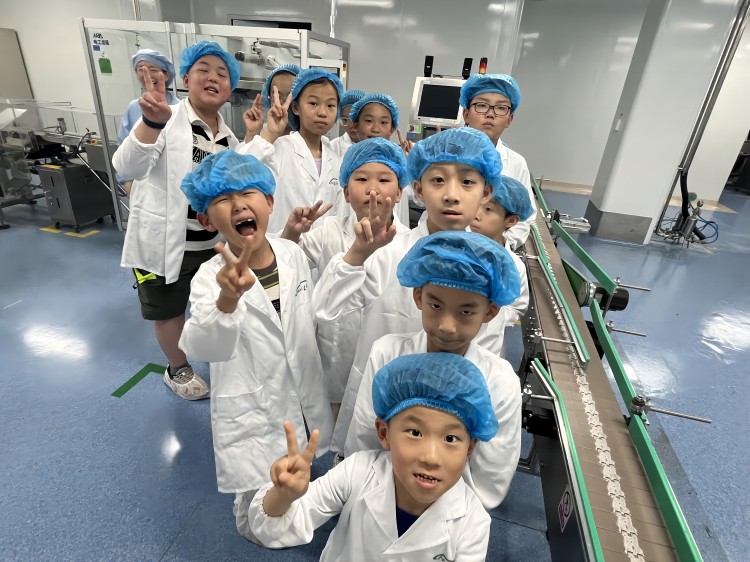 緊接著孩子們來(lái)到了小容量注射劑1號(hào)車間。在進(jìn)入生產(chǎn)區(qū)的剎那,透過(guò)巨大的玻璃展窗,孩子們發(fā)出陣陣驚嘆——儲(chǔ)水罐猶如高大威猛的巨人,佇立在光亮整潔的制水間內(nèi)。注射液的誕生之路便從這里開(kāi)始。在滅菌間內(nèi),孩子們對(duì)巨大的鐵柜子充滿了好奇,它就是飽和蒸汽滅菌柜,是藥支“蒸桑拿”的地方。孩子們?cè)谶@里學(xué)習(xí)到了溫度與微生物之間的親密關(guān)系。在燈檢間內(nèi),巨大的星輪圓盤(pán)與隊(duì)列整齊的藥支們?cè)V說(shuō)著質(zhì)量第一的故事。最后,在包裝間內(nèi),從分托入托機(jī)到裝箱機(jī),藥支們陸續(xù)穿上漂亮的服裝,成功誕生為完整的產(chǎn)品。孩子們了解到,每一支注射劑的誕生,都是科技與智慧的結(jié)晶,是保護(hù)人類健康的超級(jí)英雄。