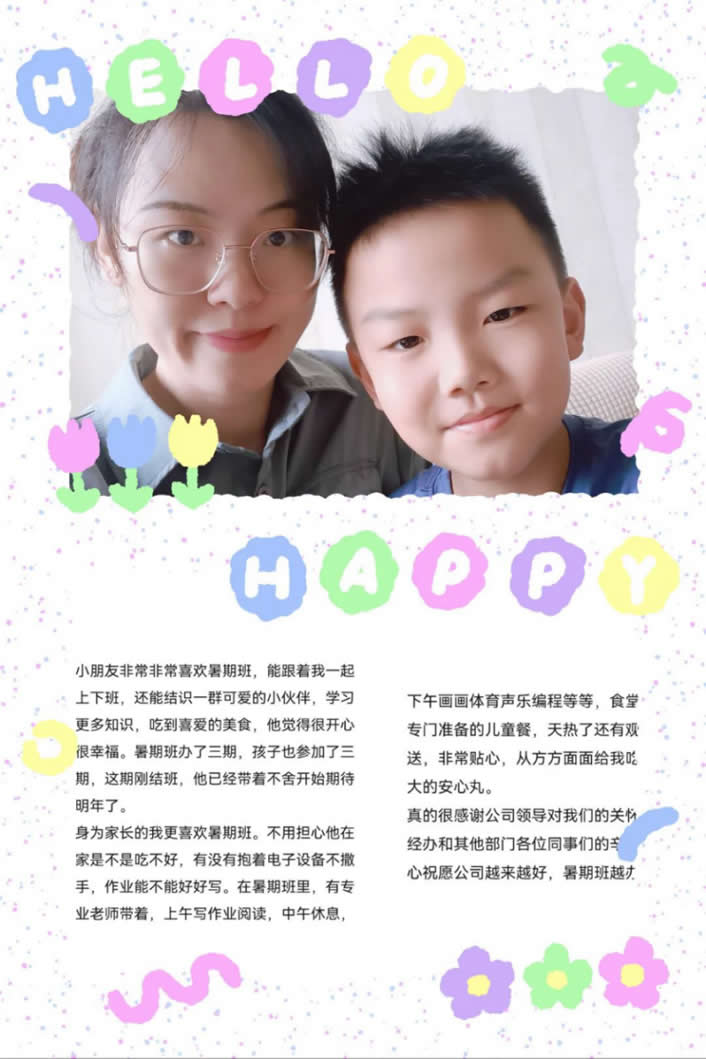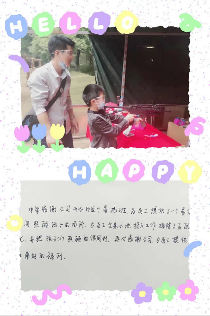 非常感謝公司開(kāi)辦的這個(gè)暑托班,為員工提供了一個(gè)暑假期間照顧孩子的場(chǎng)所,為員工全身心地投入工作排除了后顧之憂,并把孩子們照顧的很周到,再次感謝公司,為員工提供了非常好的福利。