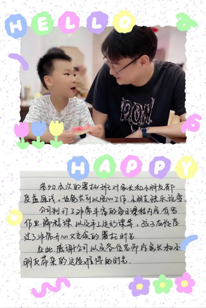 參加本次的暑托班對(duì)家長(zhǎng)和小朋友都受益匪淺,讓家長(zhǎng)可以安心工作,小朋友快樂(lè)玩耍。公司制訂了非常豐富的每日課程內(nèi)容,有寫(xiě)作業(yè)、編程課以及手工運(yùn)動(dòng)課等。孩子在校度過(guò)了非常開(kāi)心又充實(shí)的暑托時(shí)光。在此,感謝公司以及各位老師給家長(zhǎng)和小朋友帶來(lái)的這段難得的時(shí)光。