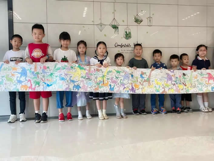 暑托班期間孩子們齊心協(xié)力,合作完成了一幅繪卷《恐龍世界》~在結(jié)營(yíng)儀式上,孩子們展開(kāi)長(zhǎng)卷,共同展示自己的成果,分享自己的感受。