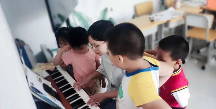 今年活動(dòng)期間,老師結(jié)合孩子們的喜好,開(kāi)發(fā)了音樂(lè)啟蒙系列課程。在一系列歌曲教學(xué)和音樂(lè)游戲中,孩子們邊玩邊學(xué),逐漸掌握了樂(lè)器、音符、音調(diào)、節(jié)奏、情緒等基礎(chǔ)樂(lè)理知識(shí)。