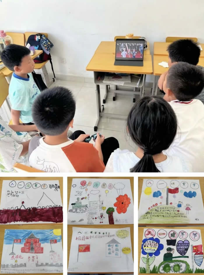 “八一”建軍節(jié)之際,老師組織了孩子們觀看閱兵儀式視頻,讓大家感受軍人的風姿、武器的先進和國力的強大,也借此機會對孩子們進行了愛國主義教育。孩子們將心中對祖國的美好祝福,一筆一畫地描繪在張張白紙上,用五彩繽紛又充滿想象力的畫作共同慶祝“八一”建軍節(jié)。