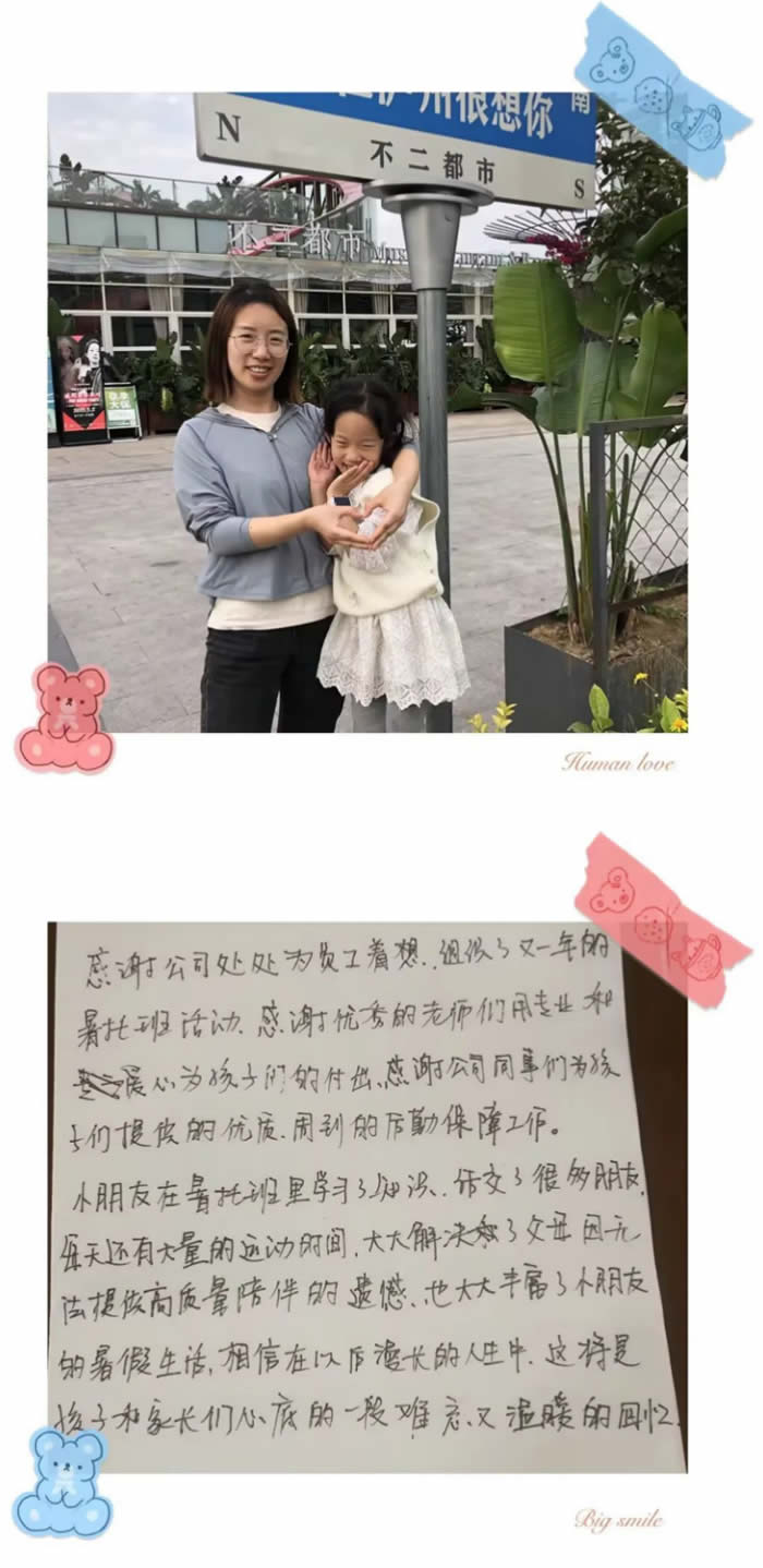 感謝公司為員工解決暑假照顧孩子的困難,這項福利讓身邊的親朋好友羨慕啦!今年孩子肉眼可見的成長了,能做到好好吃飯、好好學習、好好玩。不僅認識了很多小朋友,還認識了很多叔叔阿姨。感謝公司后勤保障部門的付出,也感謝太陽老師和龐老師,你們是最棒的!