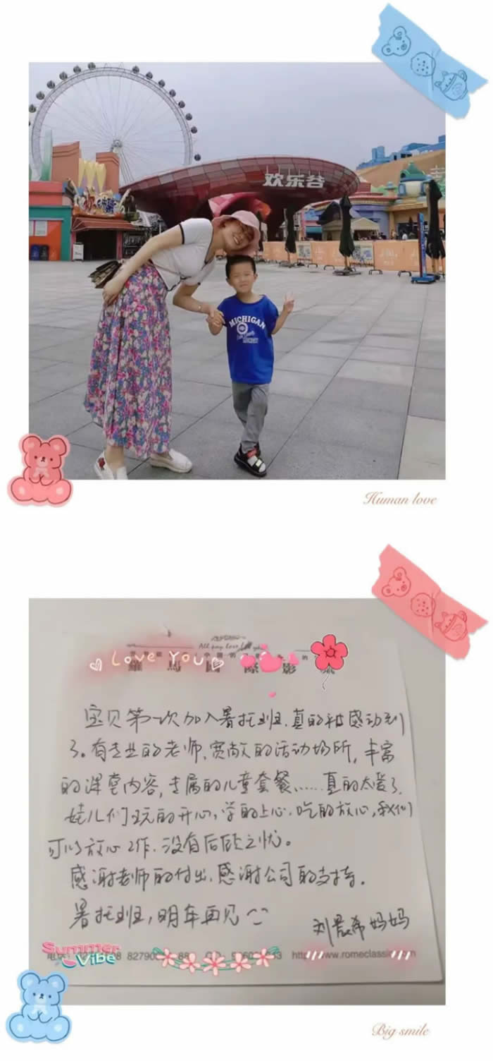 可可小朋友,很開心你又度過了一個愉快的暑假,短暫的一個多月暑托班學習,你帶來的驚喜、進步、變化非常之多。很感謝公司提供平臺,感謝老師們的辛勤付出,解決家長帶娃問題。明年咱們再見!