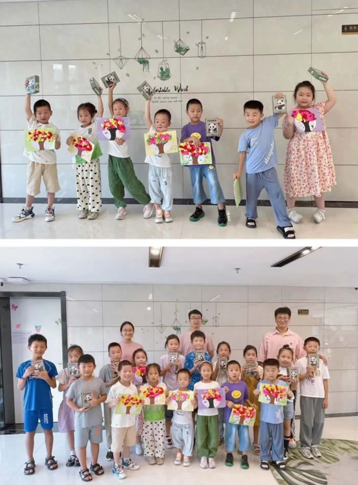 小班的孩子們也帶著自己的作品,紛紛加入展示的行列。最后,老師們?yōu)槊课缓⒆佣妓蜕狭梭@喜的結(jié)營禮物——國寶熊貓畫畫積木。領(lǐng)取完禮物的孩子們和老師們一同在鏡頭前留下了最可愛的模樣。