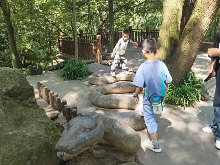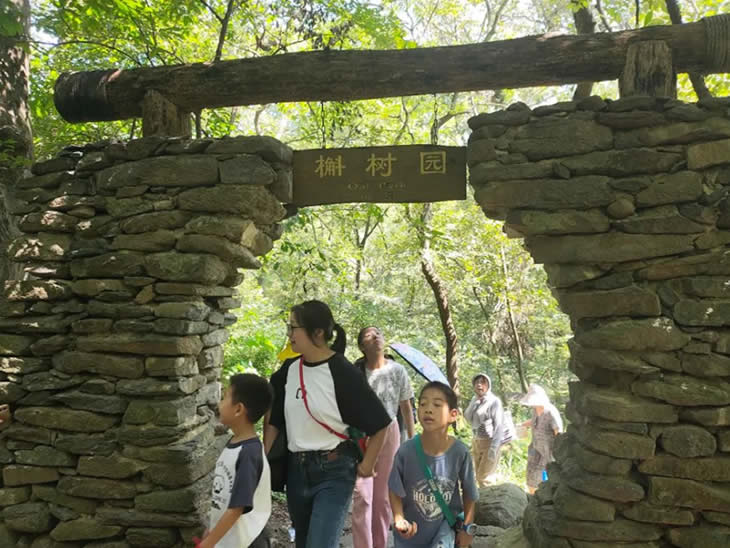 綠樹蔭濃夏日長(zhǎng),行程第一站是鐵山寺國(guó)家公園。在導(dǎo)游的講解與陪同下,工匠與家屬步行2小時(shí)穿越這處天然氧吧。途中經(jīng)過(guò)鐵山寺、孔雀園、蟒蛇澗、石鼓堆等兼具人文氣息與自然美景的林中站點(diǎn),認(rèn)識(shí)了“咬人樹”漆樹、金錢草等植物,在伏案工作之外獲得天然體驗(yàn)。