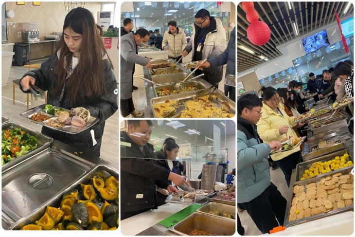 菜名吉利、美味豐盛的各色美食次序排開。大家一時難以抉擇,紛紛表示“我全都要”。餐盤中,海鮮肉食、清爽鮮蔬、精美糕點、甜蜜水果很快摞起一座高高的小山?!靶虏松峡?!”司務(wù)長一聲吆喝,又引得無數(shù)圍觀,好不熱鬧。